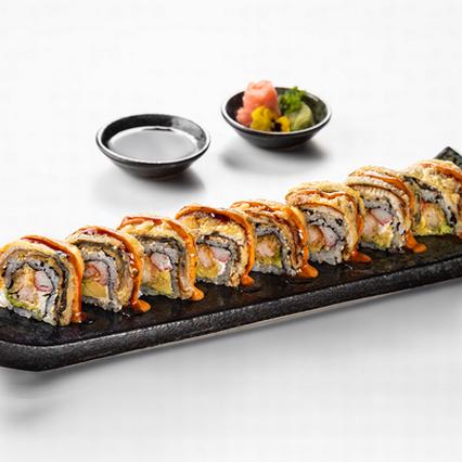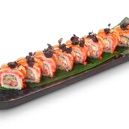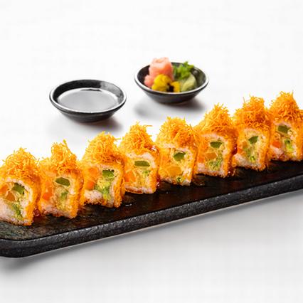 Voracious flavor Sushi roll stuffed with cream cheese, prawn tempura, cucumber, avocado and crabstick mayo mix, rolled in rice mixed orange tobiko, black sesame seeds and crispy tempura, topped with avocado, salmon cream cheese, prawn tempura. Drizzle with Sumo signature sauce, crowned with green tobiko and Sakura mix
