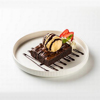 A delicious melt in mouth brownie, served with a scoop of ice cream, drizzled with chocolate sauce