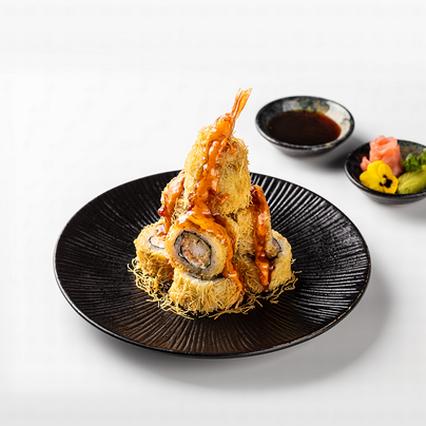 Crispy tempura, kani, cucumber, and cream cheese wrapped in sushi rice and nori, topped with golden kunafa and finished with Sumo signature sauce and spicy mayo.