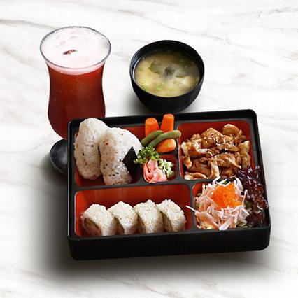 Items: Cucumber Crabstick Salad, Chicken teriyaki, or (Chicken Katsu), 4 pcs California or (3 pcs avo maki & 3 pcs kappa maki), Onigiri Rice, Miso Soup and Red Iced tea